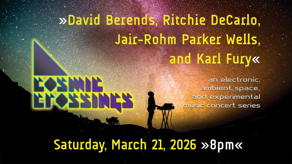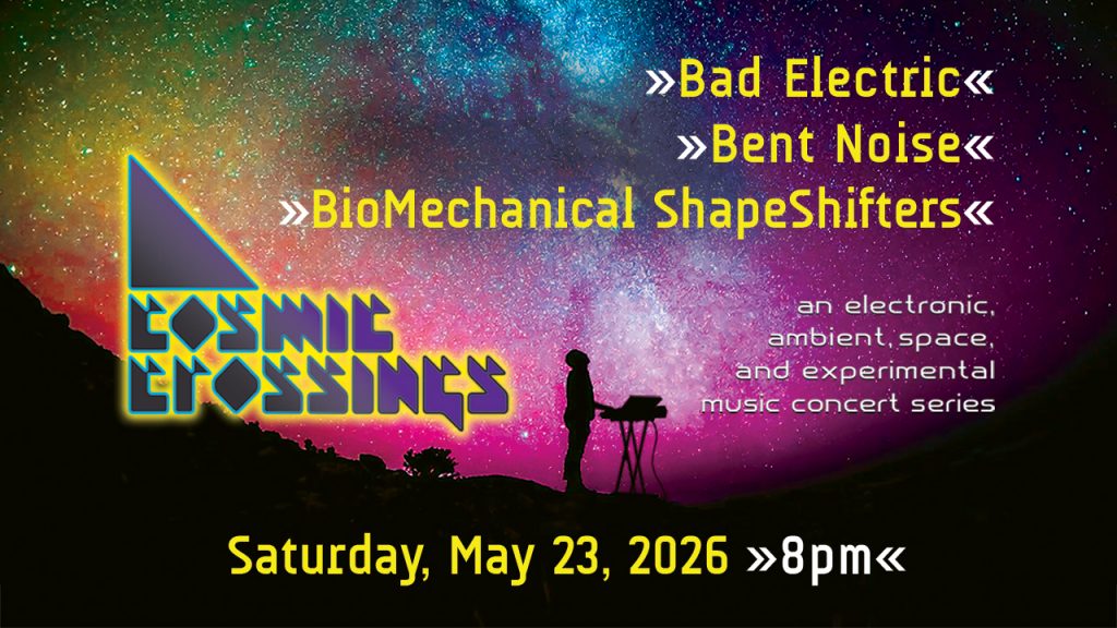 The Cosmic Crossing Concert Series was created by Nick Mellis, Mike Hunter, and Ken Palmer. (Mike has since stepped down in 2024). Current “Ground Control” staff include Karl Fury (sound engineering) and Patrice DeVincentis (video production). We thank our friends, family, fellow musicians, and our audience for their continued support of this all-volunteer production. We devote our time producing this series solely to share our love of this unusual and wonderful music genre with others!