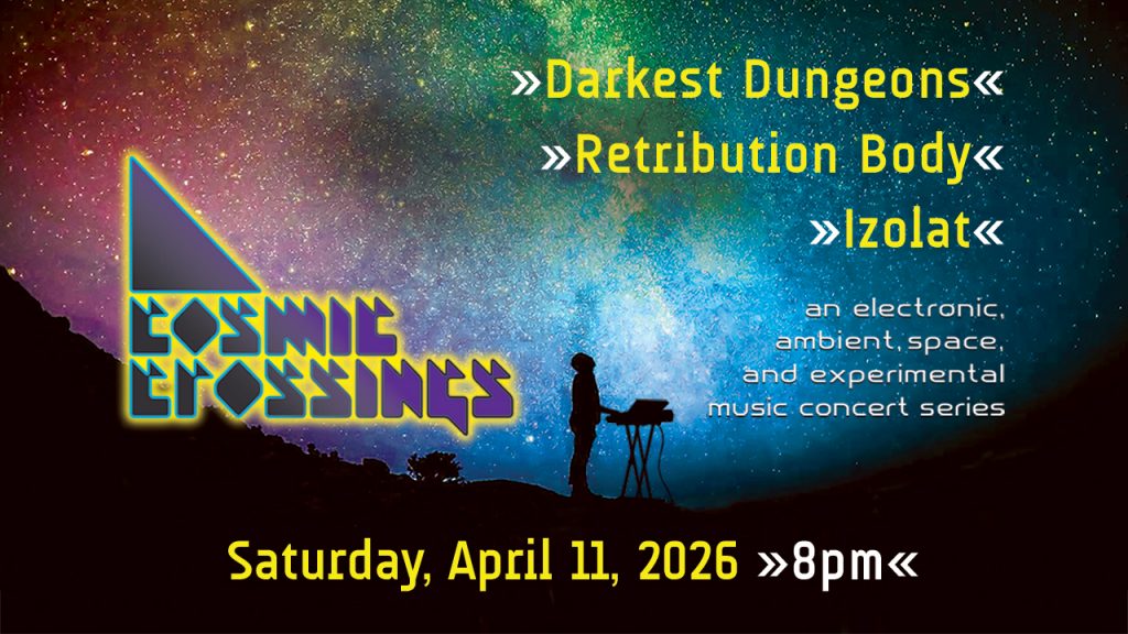 PYXL8R is the ongoing solo project of Brainstatik keyboardist and Cosmic Crossings co-founder Ken Palmer. Atmospheric, otherworldly, and always dense with unusual sonic textures, PYXL8R’s long-form synthesizer compositions are always performed completely live with no backing tracks. To achieve all of this on stage, Ken is joined on synths and iPad by his talented son Kyle , who has contributed to the live PYXL8R shows for many years. Ken’s wife Ruth is in charge of presenting the accompanying multimedia visuals. Unfortunately, Sage – who usually participates in PYXL8R performances – will not be available for this show.